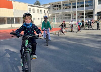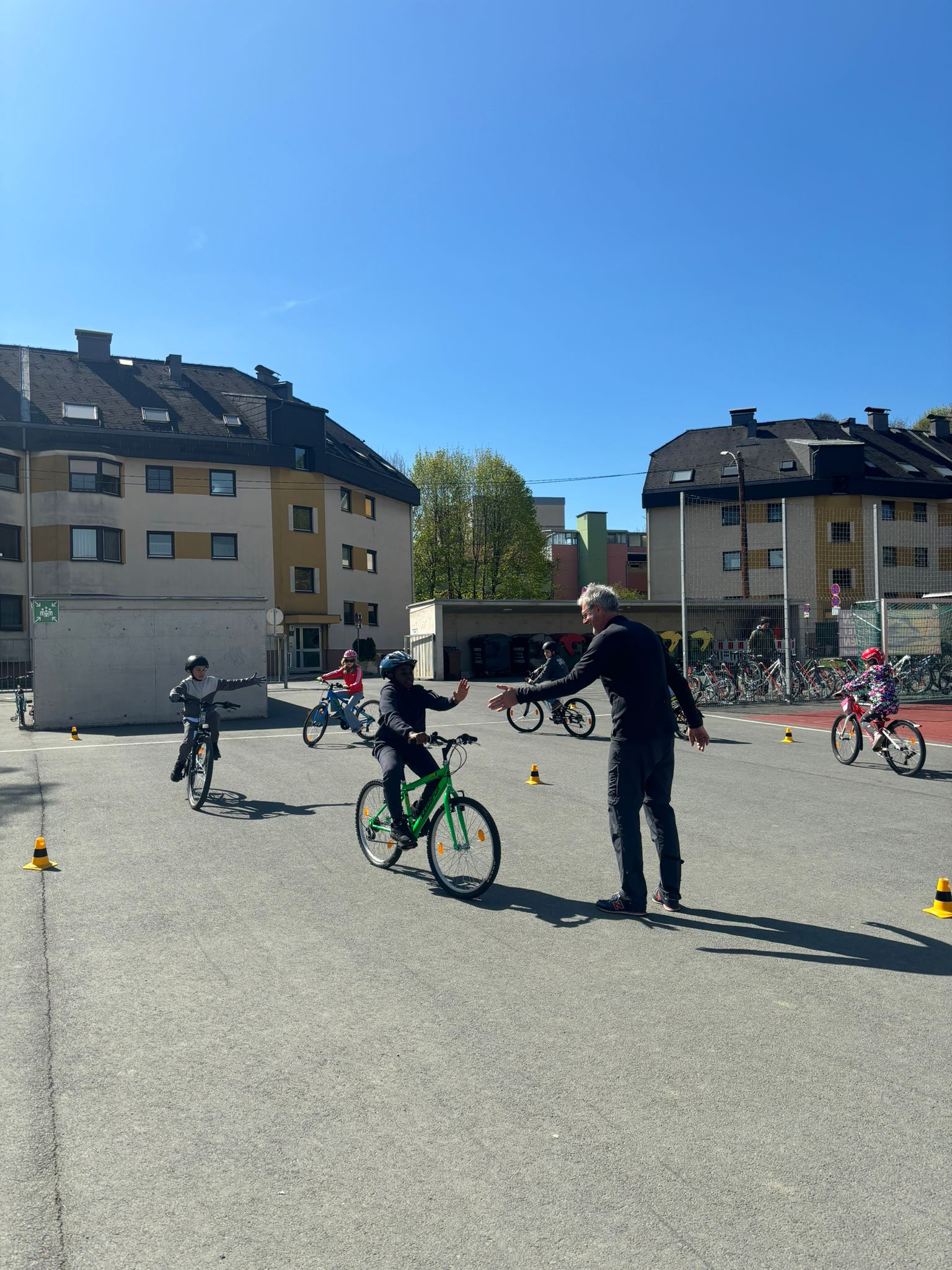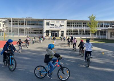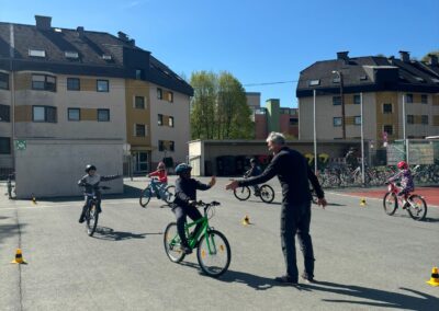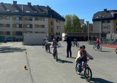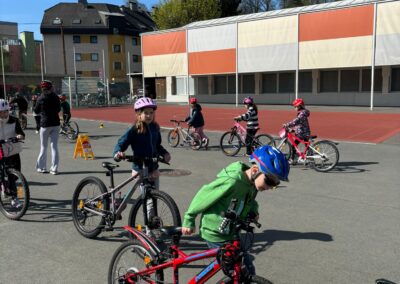 Danach ging es voller Motivation in den praktischen Teil. Die Kinder übten richtiges Bremsen, das sichere Fahren sowie das korrekte Geben von Handzeichen. Für besonders viel Spaß sorgte das „Langsamfahr-Rennen“, bei dem ausnahmsweise nicht die Schnellsten, sondern die langsamsten Fahrerinnen und Fahrer gewannen. 🏆